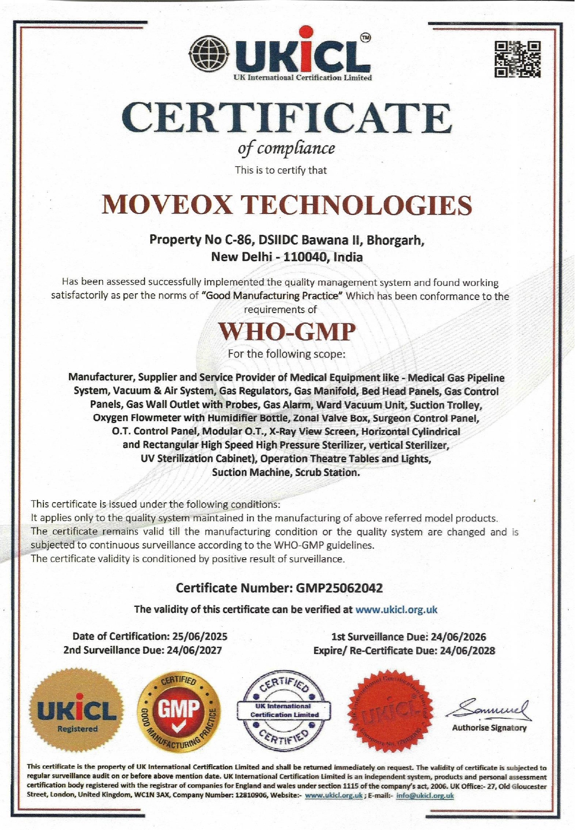 Moveox Technologies is one of the prominent ISO 9001:2008, ISO 13485:2003, ISO 14001:2004, WHO/GMP & CE certificated Company, specializing in the production of Medical Gas Pipe Line System, O.T. & I.C.U. Furniture, Operation Theatre Tables and LED Operation Theatre Lights in India and providing our services from last 10 years. We have the privilege to design and distribute the most sophisticated and technological latest products in the service of medical profession. Our Research and Development department is continuously involved in designing & developing better design and technical solution at the required standard by the customers.