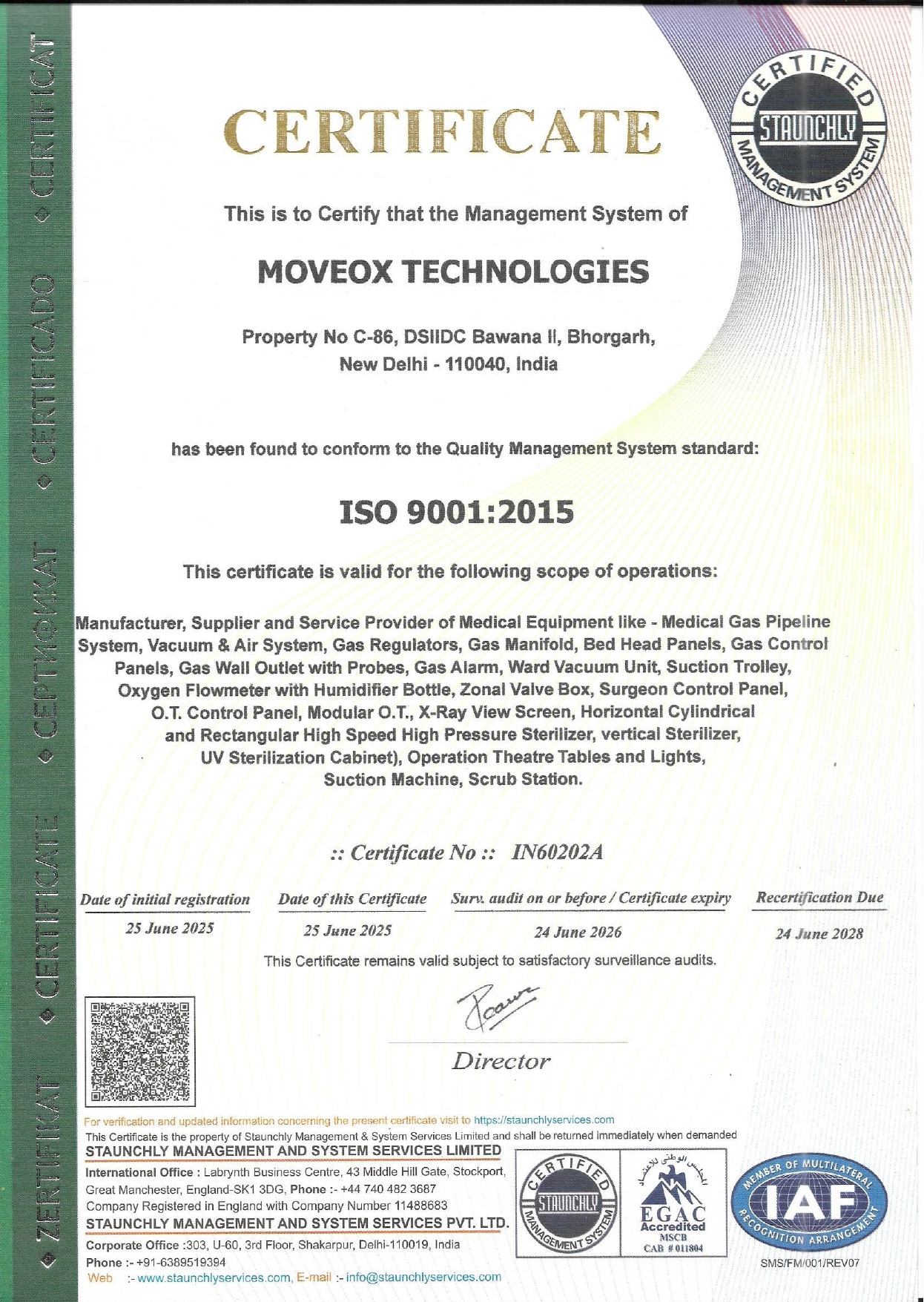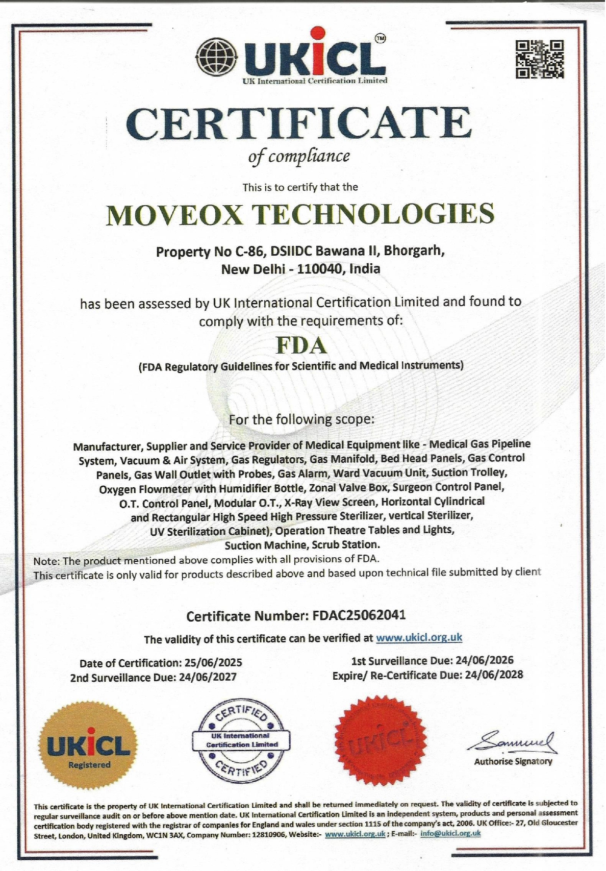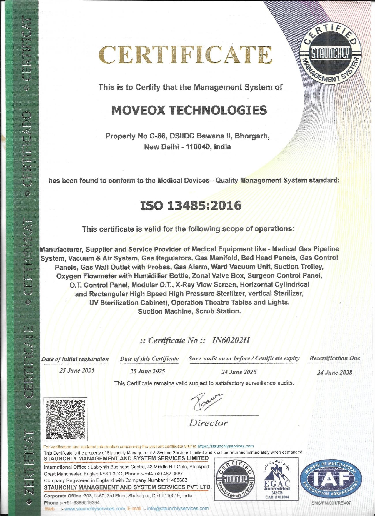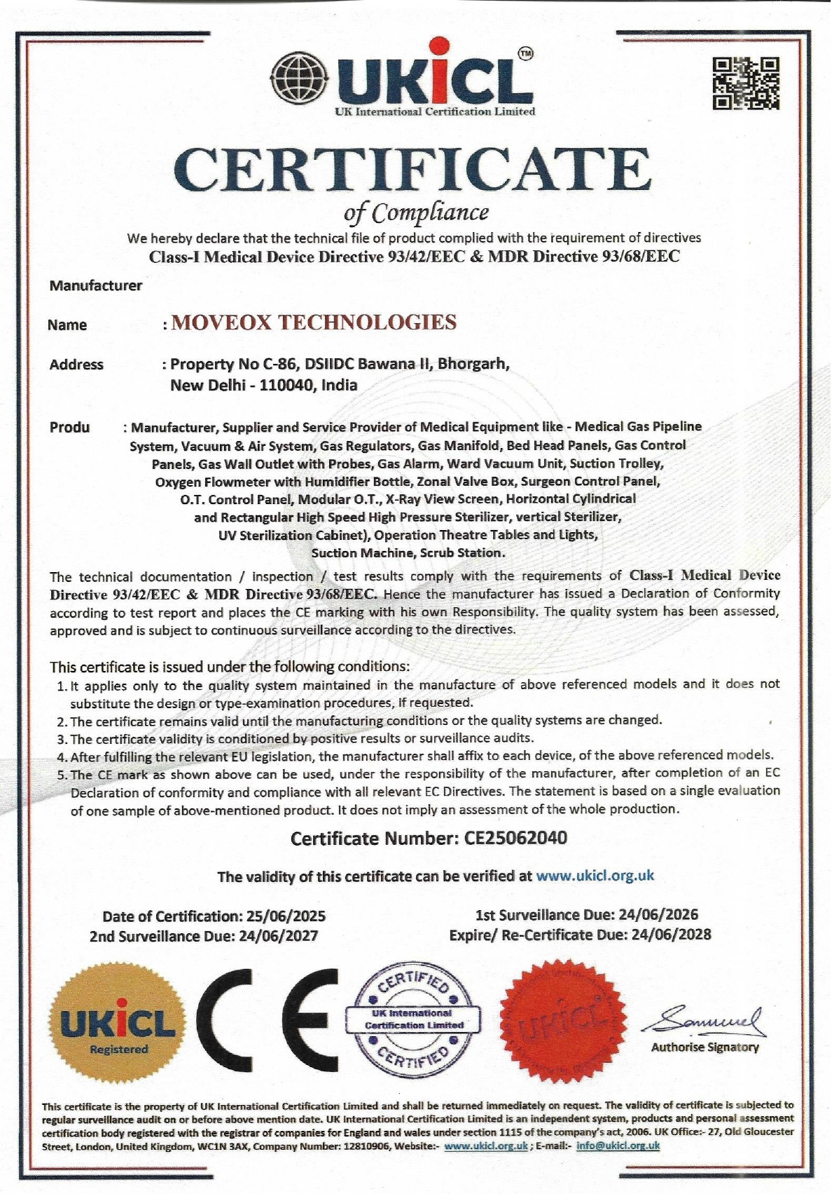 Moveox Technologies is one of the prominent ISO 9001:2008, ISO 13485:2003, ISO 14001:2004, WHO/GMP & CE certificated Company, specializing in the production of Medical Gas Pipe Line System, O.T. & I.C.U. Furniture, Operation Theatre Tables and LED Operation Theatre Lights in India and providing our services from last 10 years. We have the privilege to design and distribute the most sophisticated and technological latest products in the service of medical profession. Our Research and Development department is continuously involved in designing & developing better design and technical solution at the required standard by the customers.